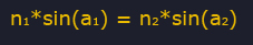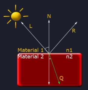 Where n1 and n2 is the index of refraction for each of the two materials, a1 is the angle between L and N, and a2 is the angle between Q and N.