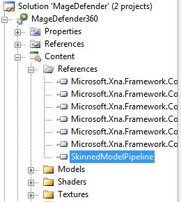 2 – Add the SkinnedModelPipeline.dll file to the Referenced under Content in the Mage Defender project: