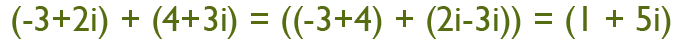 It is very simple to add or subtract two complex numbers together. Say we got two complex numbers where one is z=-3+2i and another is w=4+3i, and we want to add these together (z+w):![]()