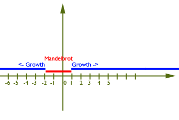 As the real number grows outside –2 and 1, any imaginary number will grow outside –2i and 2i. On other words, all imaginary numbers inside the red circle do not grow. These numbers are called the M-Set.