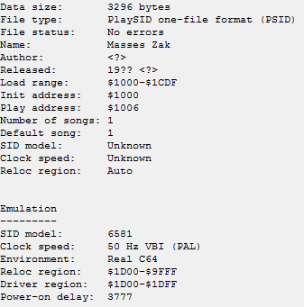 You can create your own music, but since I’m nothing near a musician, I downloaded a music and used this in our example. The file is named music.sid, and the title of the song is “Masses Zak”. I got the file from High Voltage SID Collection, a page with a huge archive of C-64 music. Be sure to take a look! ![]()