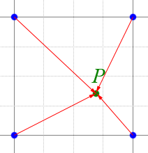 Then you interpolate between all of the values computed above to get the final value for point P. If you are in 3D space R3, you will have 8 surrounding grid points, and 7 interpolations to get the final value.