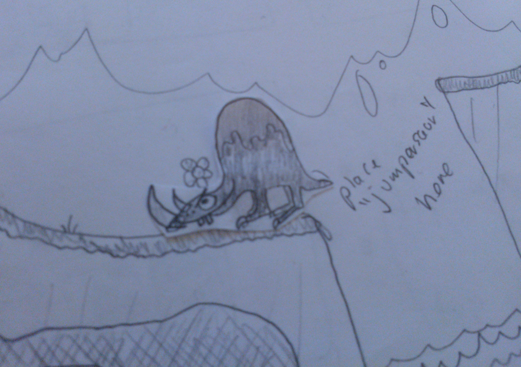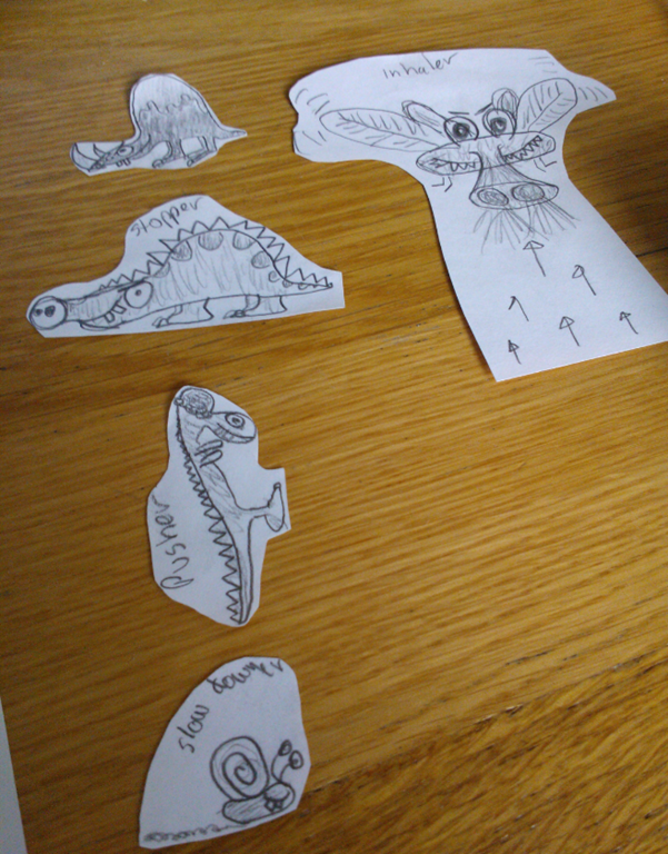 This meant that I needed some dinosaurs with different abilities. Combining the right dinosaurs at the correct positions will bring the egg home. I drew some dinos and cut them out so I could place them on the level I drew above.
