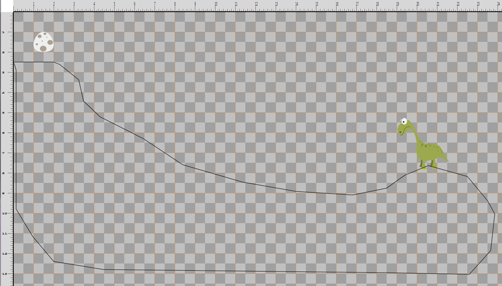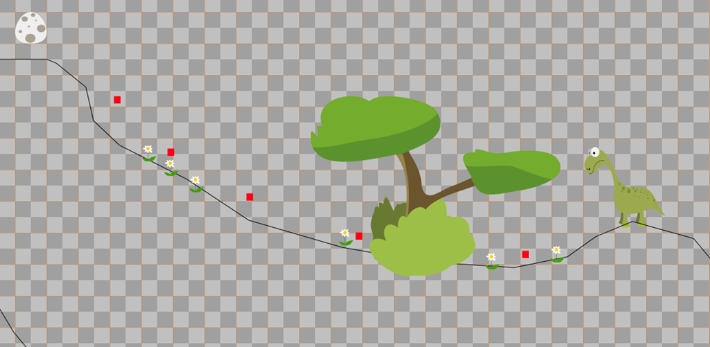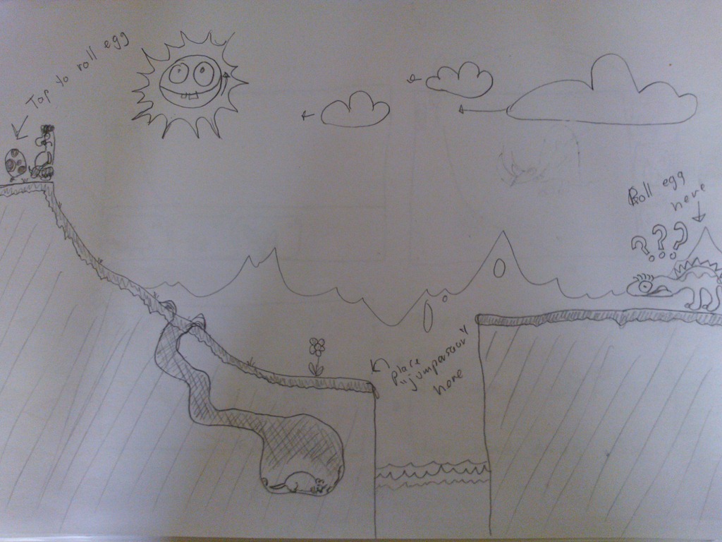 This image is my first sketch and shows the general layout. First of all, you have the egg. If you tap it, you roll it down the hill. Then you need to use helper-dinos to get the egg safely to the goal. If you can do this, you complete the level.