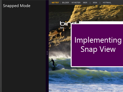 What we want to do is to hide the other layout of the app that is visible under the FullScreenLandscape-state, and make the snapped UX visible. In this case, i just want to hide everything in snapped mode and show a new controller, a TextBlock with the text SnappedMode.