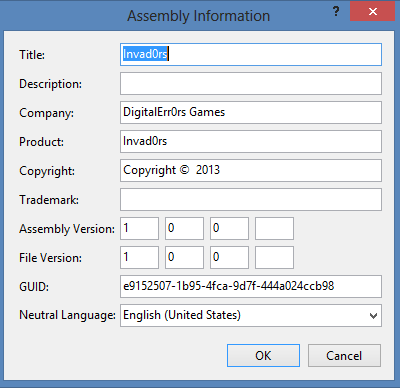 Next, we need to set a few properties for the assembly we will generate. Click PROJECT->Invad0rs properties![]()