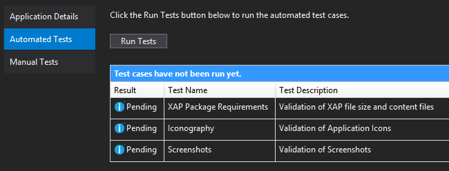 Run the automated tests to make sure the first test is passed (the XAP Package Requirements):![]()