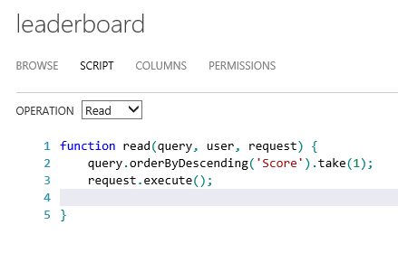 What this code does is to modify how the service are reading items from our table. What we are doing here is to modify the query that came in to the function (it was pretty much blank since we havent sent in anything from the client/game when we asked for the data), so it orders descending on score, and then takes the first item (best score since its ordered by score descending).