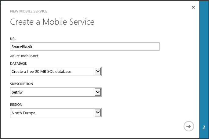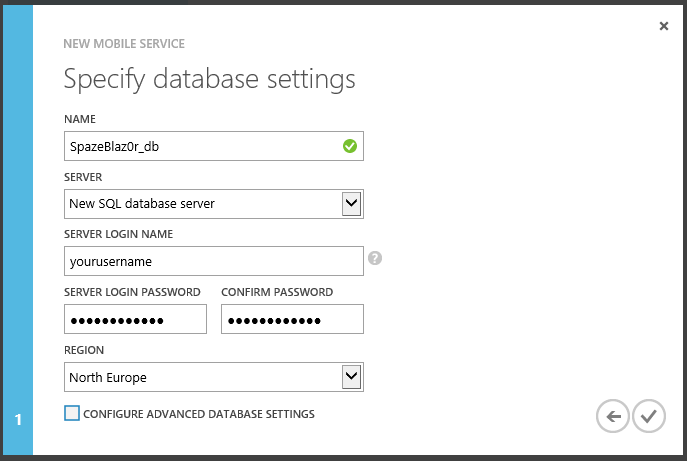Now it’s time to specify some details around the database we are going to use (SQL) for our service. Just fill out the obvious fields and press the check icon down right to start creating the service.