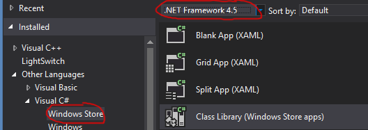 Select the Windows Store catgeroy under Visual C#, make sure to select .Net Framework 4.5 (important!) and select the Class Library (since we are creating a DLL for our Windows 8 game).