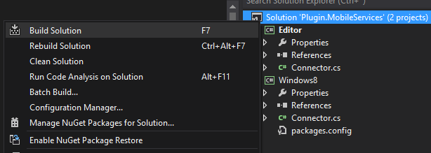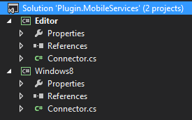 Now, open the Connector.cs file in the Windows8 project and implement the same logic as we did in the fake DLL (and make sure the namespace is the same as in the editor plugin):