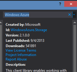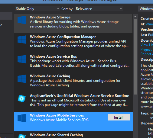 A lot of results will be displayed in the result box, find Windows Azure Mobile Services and click Install:
