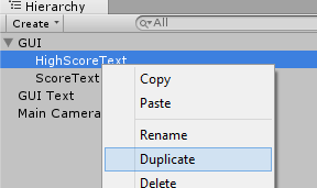 Let’s fist add the next text label in Unity. Go to the GUI game object in the scene hierarchy and duplicate the high score text game object: