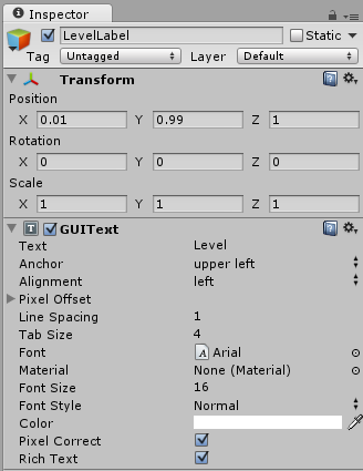 Let’s fist add the next text label in Unity. Go to the GUI game object in the scene hierarchy and duplicate the high score text game object: