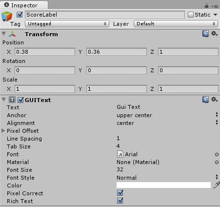 Now, go back to Unity and drag the GUI Text to the variable on the Main Camera script, and redrag the high score if needed: