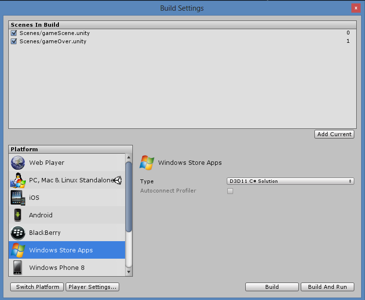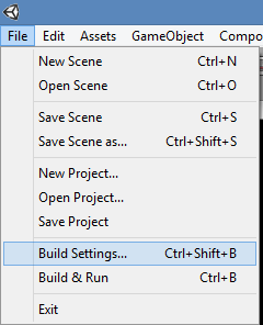 Now, we need to add the scenes we have build to the project so they can find eachother. Open the gameScene by double clicking it in the Scenes folder. Then Click File->Build Settings: